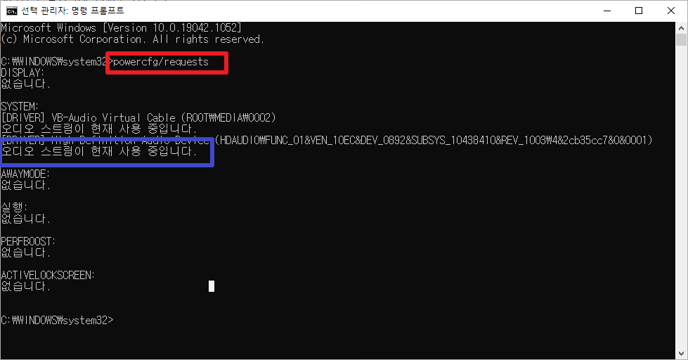 위에 화면과같이 "powercfg /requests"명령어로 확인할수있습니다.