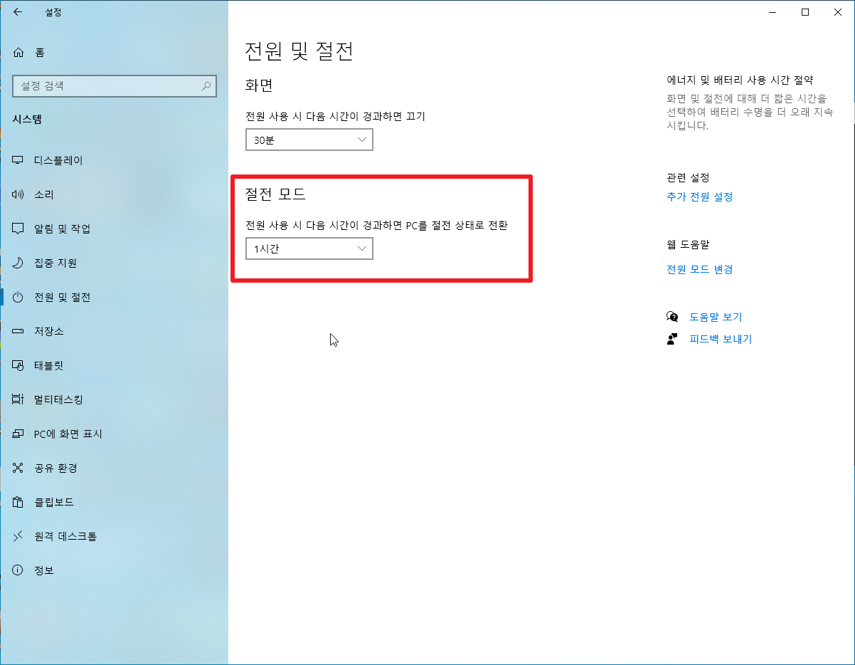 위에 방법으로 했는데도, 절전모드가 안되서 꾀 골머리가 아팠는데요. 절전모드 시간이 변경되어 있을수 있으니 조치후 반드시 전원 및 절전의 시간을 확인하시기 바랍니다. (테스트 시에 시간단축을 위해 '1분'으로 설정하고, 정상작동하면 절전모드 시간을 제대로 잡아주면됩니다.