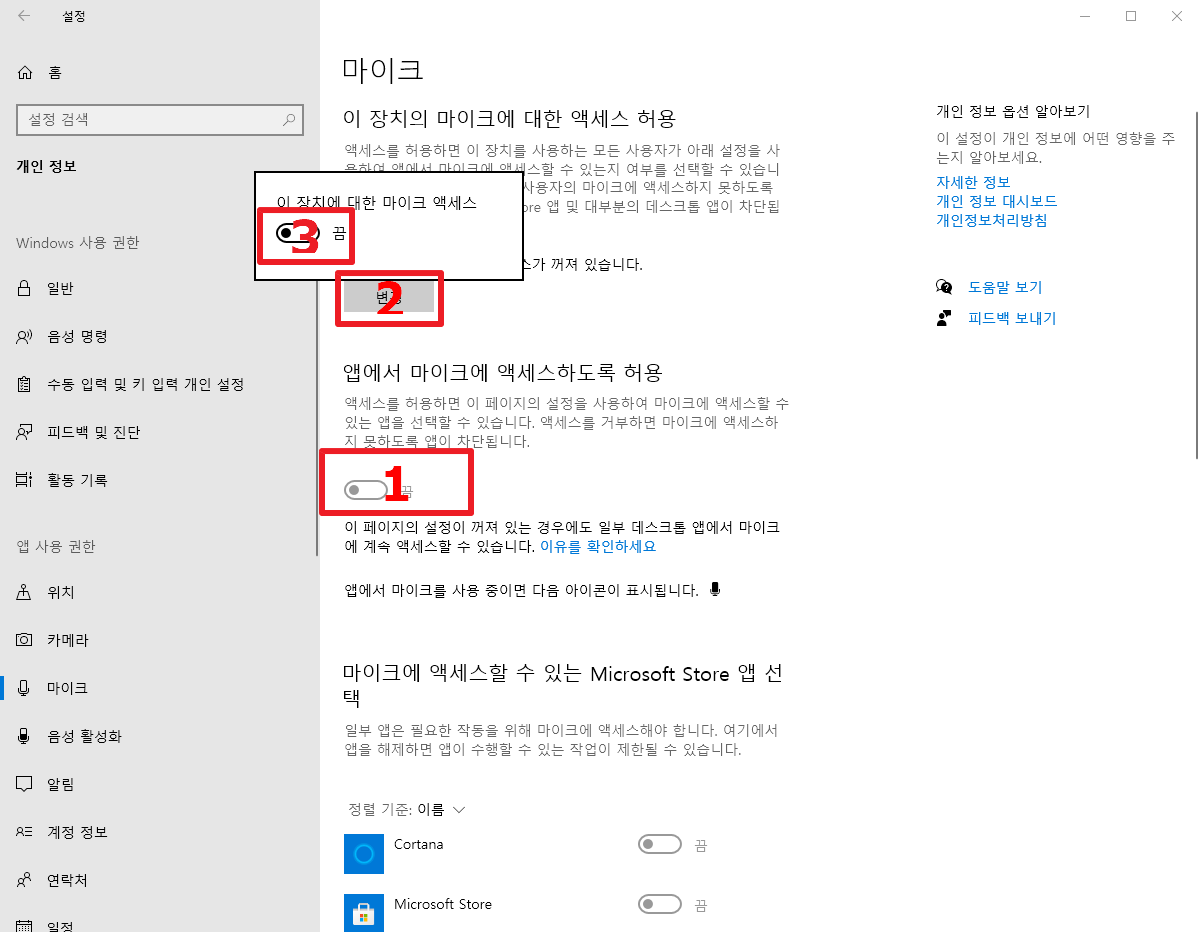 코타나 뿐만아니라, 마이크를 액세스하는 프로그램 모두를 꺼야하는데요. 간단하게 1번항목의 앱에서 마이크에 액세스하도록 허용을 "끔"으로 바꿔주면 됩니다.